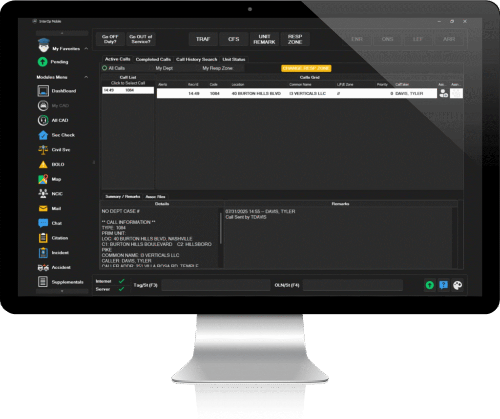 InterOp Mobile Data & Field Reporting delivers a fully connected experience for law enforcement, combining real-time database access, officer communication, and field-based report generation, all from the patrol vehicle. Designed for officers on the move, this solution empowers law enforcement professionals to work more efficiently, reduce response times, and complete critical documentation without returning to the station.