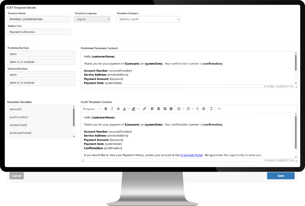 Utility providers must be able to contact customers in a quick and convenient manner. Rather than re-writing the same email or text for every customer, eNotify allows you to create content templates with dynamic variables. Created through eAdmin, and integrated with utility systems of record, these templates can automatically pull information like name, account number, balance, and more to create a personalized message for all recipients. Save these templates for an easy way to send mass notifications with consistent messaging to customers.
